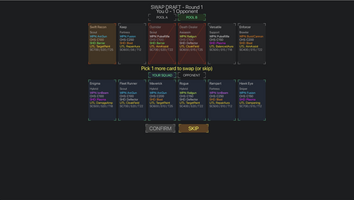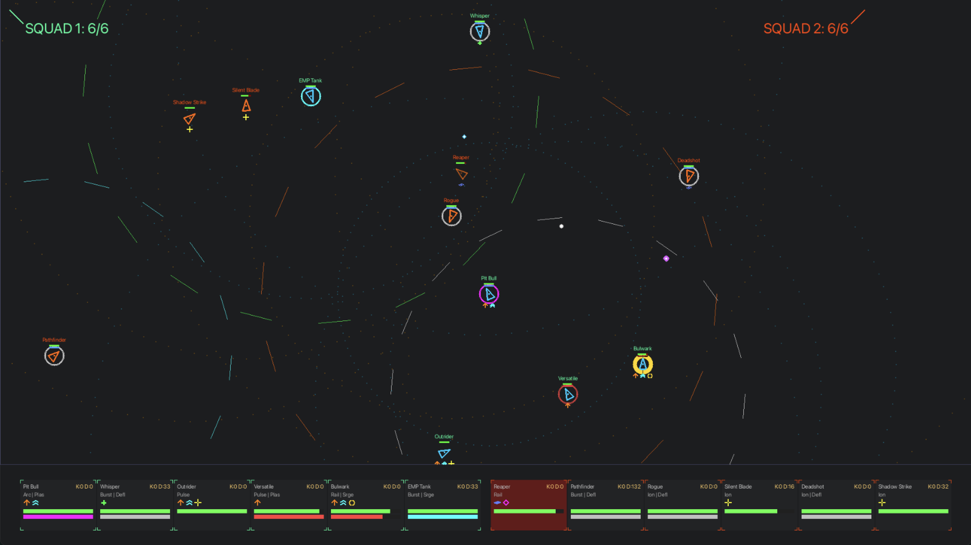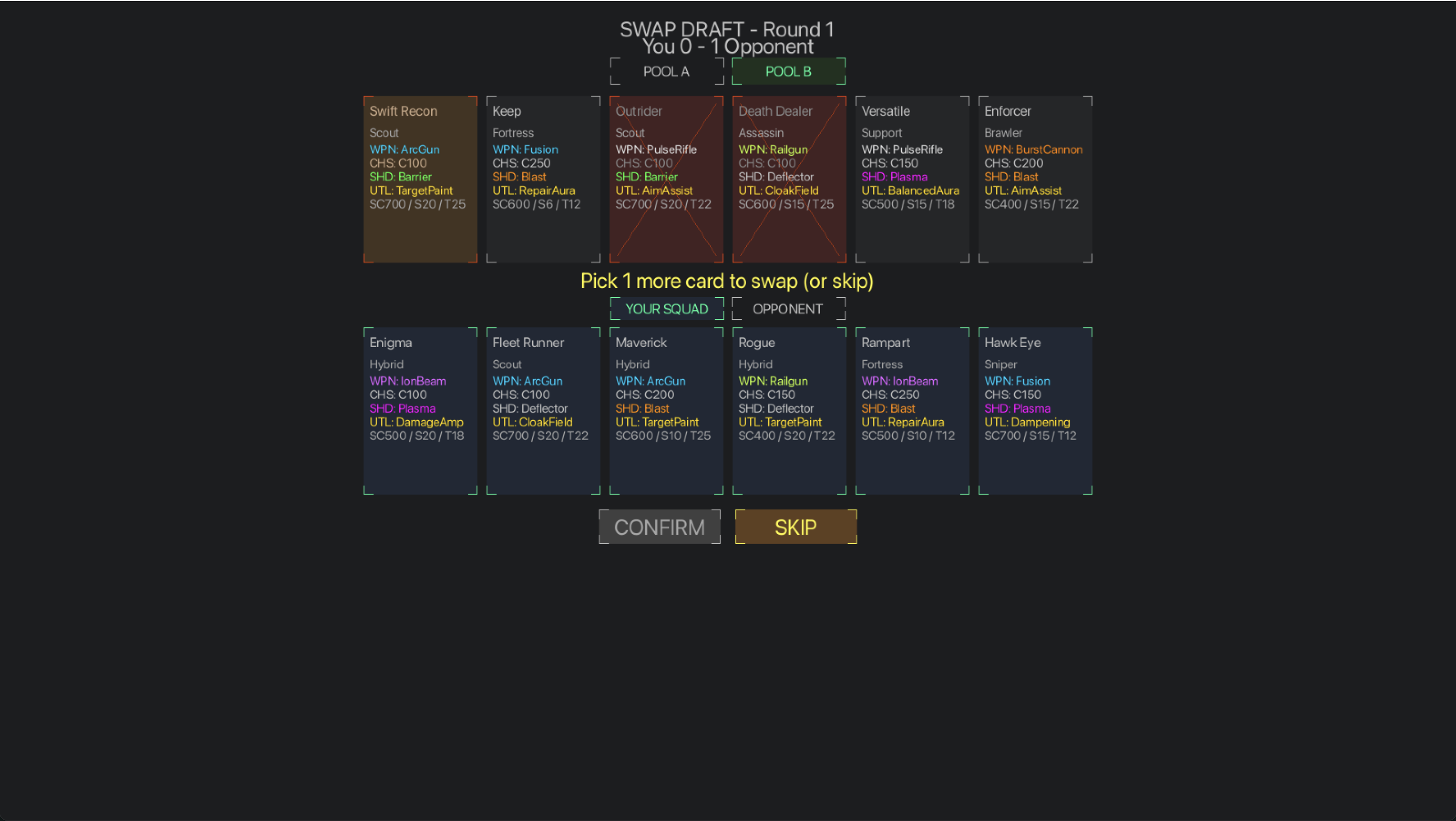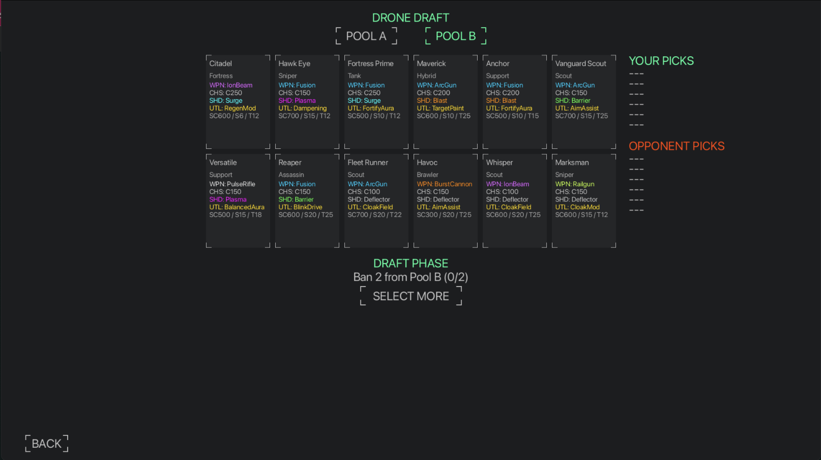 Anyway, the idea—for now—is simple. Draft your squad of autonomous drones, predict and counter your opponent's picks. So far, we have a single-player game with a Dota 2-style ban/pick drafting system, the first to three wins (see the README.md for details on the mechanics)